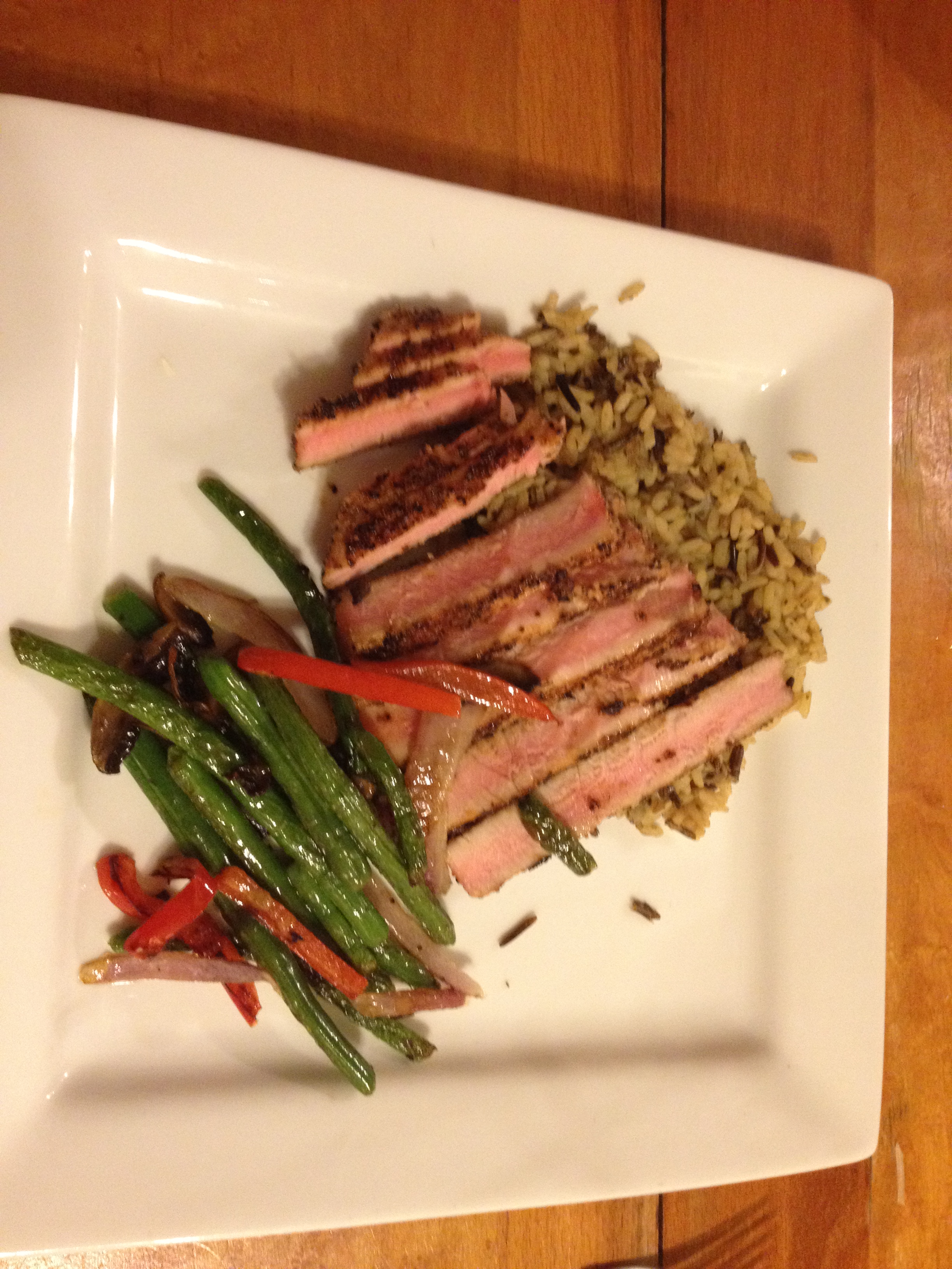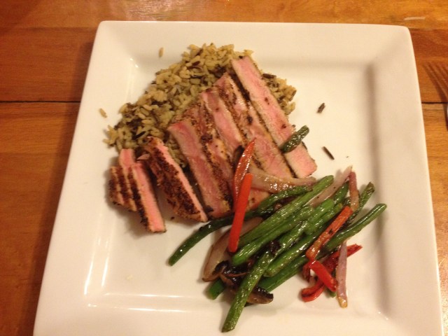The entree Special that night was quite a treat: “Southwestern-style Seared Tuna served with Wild Rice and Vegetables.”